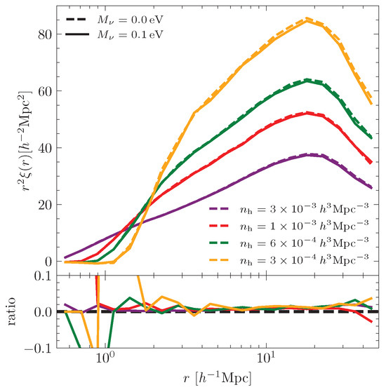 Two-point correlation function of halos in different number density form the simulation with the sum of neutrino mass (solid line) and (dashed line). The bottom panel shows the ratio between different neutrino masses.