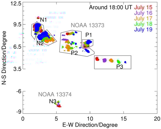 The temporal evolution of NOAA 13373 and 13374 during the period from 15 July to 19 July. The colorful patches present the morphology of the sunspot umbra around 18:00 UT on each day. Pixels with brightness less than 0.65 times the brightness of a quiet Sun in a continuum are counted. X- and Y-axes are along the east–west and north–south direction, with their unit in degrees.