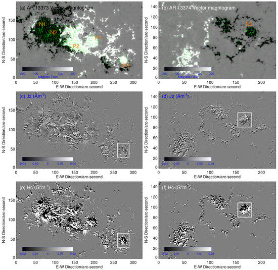 Based on vector magnetic field observation, the vertical current density can be calculated through . Meanwhile, the z-component of the current helicity , which describes the chirality of the solar magnetic field, can be calculated by . As discussed in [28], the error of is estimated to be of the order of 0.02 A m−2. The corresponding error for is around 0.01 G2 m−1. The map is shown in the second row in Figure 2. We find that is almost evenly distributed over NOAA 13373. In particular, there is no strong current density area that can be found along PILs. Many previous studies stated that strong current densities along the PILs indicate the area where magnetic free energy is mainly stored (e.g., [29]) and where magnetic reconnection probably occurs (e.g., [30,31]). This is consistent with the behavior of NOAA 13373, which only host several C-class flares during its solar disk passage. Around P3 and N3, there is also no strong current density area.
