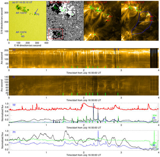 Overview of the observations. (a) Continuum image of HMI; (b) longitudinal magnetic field of HMI; (c) AIA 171 Å image on 18 July 19:31 UT; (d) AIA 171 Å image on 18 July 22:12 UT; (e) time–intensity plot within the blue contour area along the y direction and during the time period from June 16 to June 20. Green short lines indicate the time period of the appearance of the MFR, which is studied in the present study. Two short blue lines indicate the time of the image, as shown in Panel (c,d); (f) time–distance plot along the white line in Panel (d); (g) black, blue, and green curve shows the flux variations in AIA 171, 94, and 304 Å observations around P3, as indicated by the black box in Panel (b). Red curve shows the profile of the GOES flux in the 1–8 Å energy band. The black short lines indicate the time that the GOES flare (flare class greater than or equal to C-class) occurred in AR 13373; (h) black, blue, and green curve shows the flux variation in AIA 171, 94, and 304 Å observations around AR 13374, as indicated by the red box in Panel (b). In Panel (a–d), the green contours outline areas where the intensity is ≤0.65 times the average intensity of the quiet Sun in the continuum image. The unit of the X-axis in Panel (e–h) is day.