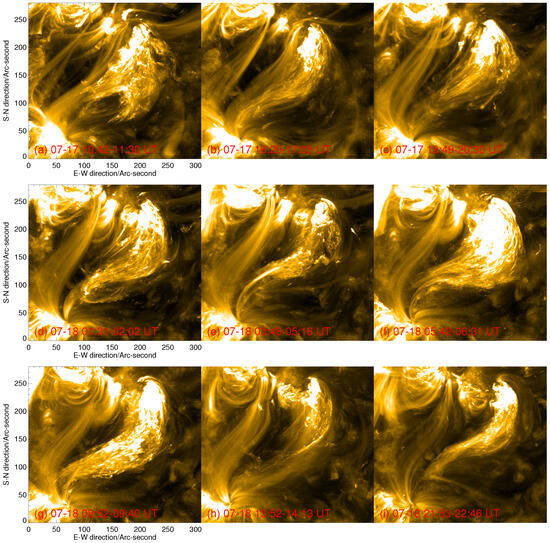 Full-disk solar images at ultraviolet (UV) and extreme ultraviolet (EUV) wavelengths were provided by the Solar Dynamics Observatory’s (SDO [24]) Atmospheric Imaging Assembly (AIA [25]), with pixel size and temporal resolution of 0.6 arcseconds and 12 s. The AIA’s 1600 Å UV band-pass is designed to observe the upper photosphere. In this study, the AIA’s 1600 Å images show the initial brightening of solar activities. For the EUV band, six band-passes (171, 193, 211, 335, 94, and 131 Å) observed the Sun from the transition region to the corona and also focused on the flaring region, with a temperature range from 0.6 to 10.0 MK. Here, we checked all EUV channels, with a particular emphasis on the AIA’s 171 and 94 Å channels. The 171 Å band-pass is sensitive to relatively cool coronal plasma (peak temperature responses of ~0.6 MK), and the 94 Å band-pass is selected for hot coronal plasma (peak temperature response of ~6.3 MK in flaring regions). The simultaneous photospheric magnetic field is obtained with a Helioseismic and Magnetic Imager (HMI [26]). The HMI on board the SDO provides the full-disk magnetic field of the Sun, with a pixel size and temporal resolution of 0.5 arcseconds and 45 s.