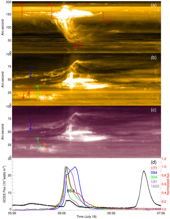 Temporal evolution of an example that occurred during the time period from 18 July 05:42 UT to 06:31 UT. (a) Same as Figure 3d, but for the time period from 18 July 05:36 UT to 07:06 UT. (b) Time–distance plot along the white line in Figure 6e. (c) Time–distance plot along the white line in Figure 6d. (d) The black curve is GOES 1–8 Å flux. The red, blue, green, purple, and gray curves are the flux intensities recorded in the AIA 171, 94, 304, 131, and 1600 Å images.