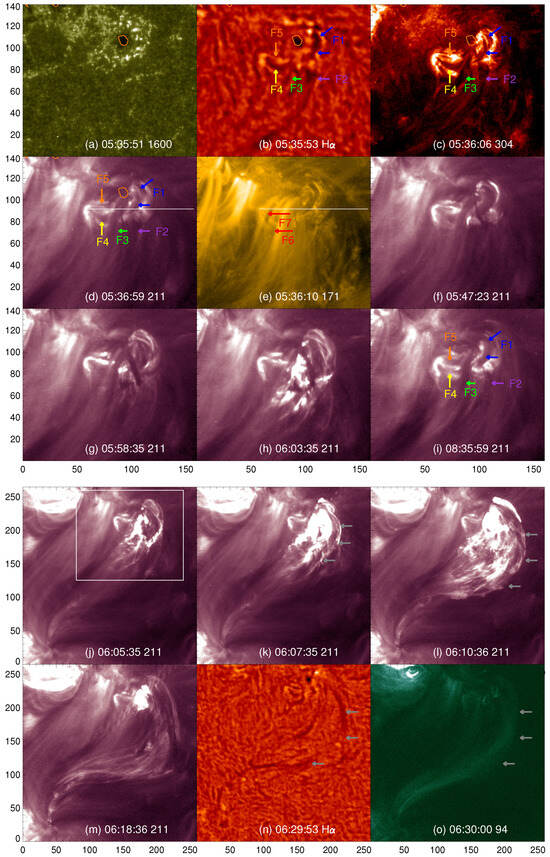 Dynamical evolution of the transient MFR observed by AIA and SMAT. (a) AIA 1600 Å image; (b,n) SMAT Hα image; (c) AIA 304 Å image; (d,f–m) AIA 211 Å image; (e) AIA 171 Å image; (o) AIA 94 Å image. The red contour in Panel (a–d) circles the umbra of P3, which is obtained by the continuum image. The colorful arrows indicate the small filaments. White lines in Panels (d,e) show the position of the slit, which is used to create the time–distance plot in Figure 5b,c.