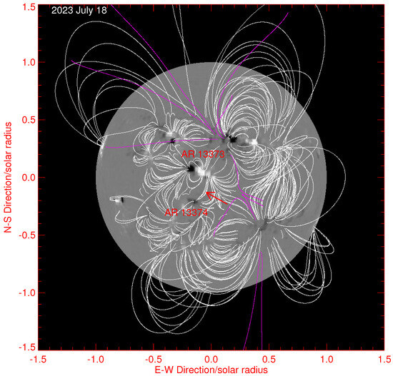 To investigate the magnetic configuration evolution associated with the recurrence of the MFR, we studied the magnetic connection between NOAA 13373 and NOAA 13374 by extrapolating coronal magnetic fields. Potential field extrapolation is the simplest method for obtaining coronal magnetic fields. It only requires a line-of-sight photospheric magnetogram as the boundary condition and is capable of reproducing the basic coronal magnetic field structure, especially for large-scale magnetic connections. We used the standard program of PSFF in SolarSoftWare (SSW) to perform potential field extrapolation [33,34]. The results show that the large-scale MFR connecting NOAA 13373 and NOAA 13374 remained almost the same during the period from 16 July 2023 to 20 July 2023. We show the example for 18 July 2023 in Figure 7. In Figure 7, the units of the X-axis and Y-axis are solar radii. As shown in Figure 7, the transequatorial magnetic structure, which connects P3 in NOAA 13373 and N3 in NOAA 13374, is outlined by a red arrow. Since the coronal magnetic structure is obtained through potential field extrapolation, we should not expect to see twists in the coronal magnetic field, which usually appear in nonlinear force-free extrapolation and are common structures of the MFR, to appear here.