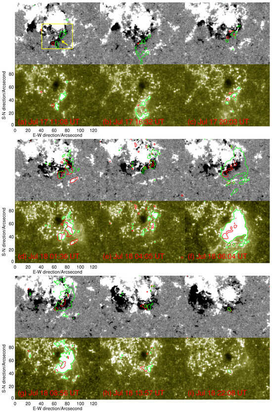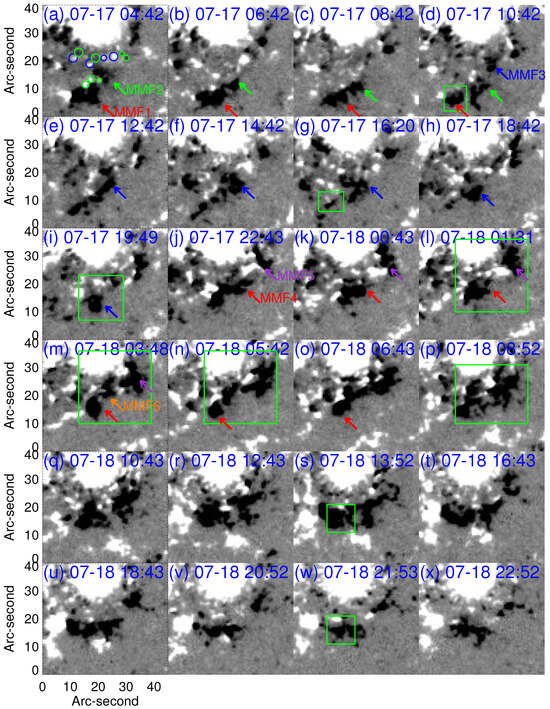 The temporal evolution of the magnetic field during the time period from 17 July 04:42 UT to 18 July 22:52 UT. Green boxes circle the initial brightening area for each event, as shown in Figure 8. Blue and green circles in Panel (a) show an example of positive and negative MMFs.