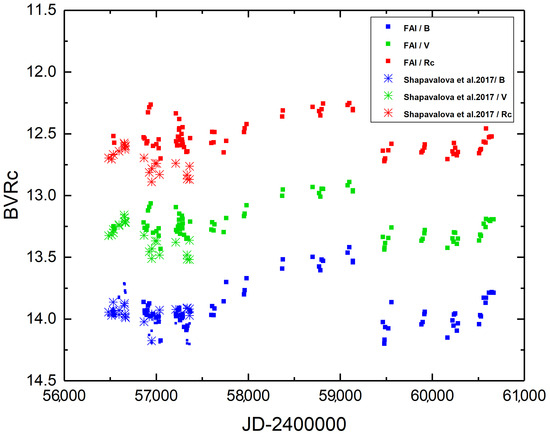 Light curves obtained in B (blue), V (green), (red) filters during 2013–2024. The X-axis shows date—2400000, and the Y-axis represents stellar magnitudes. Crosses denote data from [28]; other points are FAI data.