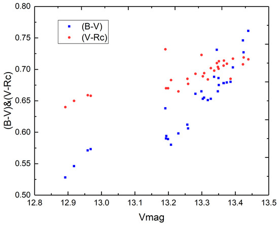 Dependence of color indices on V magnitudes. X-axis: ; Y-axis: (blue) and (red).