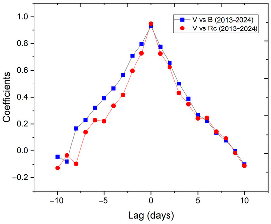 The minimum temporal resolution of our observations is 1 day, as the intervals between adjacent epochs generally do not exceed 10–30 days. This value defines the step size used in the lag estimation during the cross-correlation analysis shown in Figure 3. The diagram demonstrates that the maxima of the cross-correlation functions for V vs. B and V vs. occur at zero lag (Lag ), and the width of the central peak is approximately days, indicating a high degree of synchrony in the variations. Taking into account the data sampling and the symmetry of the correlation peaks, the uncertainty in lag estimation is day. Therefore, we conclude that the time lag between the B, V, and filters is either absent or within day, indicating simultaneous brightness variations across these bands.
