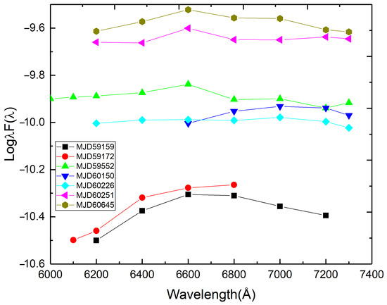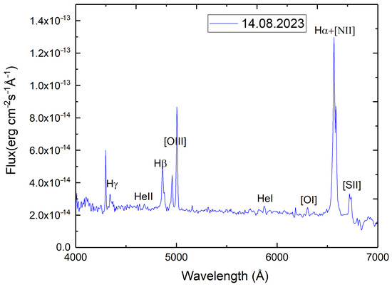 Figure 6 shows a trend of gradual increase in fluxes in the H emission line, indicating that the observed flux variations are driven by variations in the broad components of the emission lines. In the spectrum obtained on 16 November 2023, with the AZT-20 telescope, the intensity ratio of the [S ii] lines was measured as (see Table 3). Assuming an electron temperature of K, this corresponds to an electron density of –1000 cm−3, according to the diagnostic diagrams [51]. The estimation assumes isothermal conditions, a homogeneous excitation region, and negligible influence of radiation pressure.