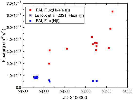 Variations in the emission line fluxes of H and H. The X-axis shows date—2400000, and the Y-axis shows absolute fluxes H and H. The H fluxes are shown. The data from Lu et al. [38] are marked with blue asterisks.