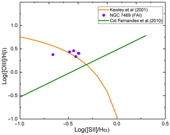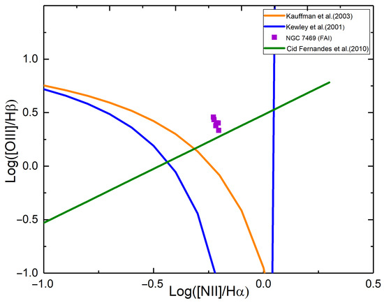 Figure 9 shows the positions of different classes of objects based on the intensity ratios of the emission lines vs. for NGC 7469.