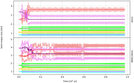 Our first goal was to make sure that the scaling of the planets’ masses and orbits does not make them internally unstable. The original system becomes internally unstable upon increasing the planetary masses fourfold. Scaling down the semi-major axes and masses of the planets does not have the same effect. Finally, we simulated the nine aforementioned systems 110 times each, with each simulation having a unique combination of scaling factors. The masses of planets in these simulations were divided by factors of 6, 4, and 2, kept in the original way, or multiplied by 2. Semi-major axes were scaled down by factors up to 50. Up to the factor 15, the scaling step was 1 (e.g., 1, 2, …, 14, 15). From 15 to 50, the step was 5 (e.g., 15, 20, …, 45, 50). This resulted in a grid of 110 possible combinations of mass and semi-major axis scaling factors. The radii of the planets were not scaled, assuming that smaller planets would be more inflated than their more massive counterparts. This is consistent with the observational data on the range of planetary densities for any given exoplanetary mass (https://exoplanetarchive.ipac.caltech.edu/exoplanetplots/nea_scatter_PS_output_pl_massj_pl_dens_pres.png, (accessed on 10 July 2025)), with the results of interior models for gas-rich planets from [29], and with the more compact nature of their orbits, which translates into higher stellar irradiation and more inflated envelopes. This choice is also equivalent to adopting a stricter stability criterion, as larger planetary radii imply larger impact probabilities and therefore lead to systems undergoing collisions more easily. It is important to emphasize that the mass scaling factor is applied only to the planets. Regardless of the scale of the system, the central star always has a mass of one solar mass.