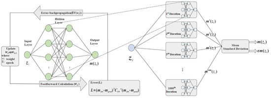 We explore the apparent magnitude−redshift relation using a hybrid model that integrates artificial (ANN) and Bayesian (BNN) neural networks. The ANN component models the relationship between redshift and apparent magnitude, while the BNN quantifies predictive uncertainties, accounting for the covariance errors inherent in the SNe Ia observations. Through backpropagation [86], the network iteratively refines its weights to minimize the loss function2, ensuring robust predictions. While ANNs excel in capturing complex patterns, they lack inherent uncertainty quantification. To address this, we employ a BNN approach, utilizing dropout to approximate Bayesian inference [87,88]. The ANN with dropout is run for 1000 iterations, producing a distribution of predicted magnitudes for each redshift. The mean of these predictions serves as the final , with the standard deviation providing the uncertainty . The ANN processes redshift inputs to generate corresponding apparent magnitudes , as illustrated in Figure 1.