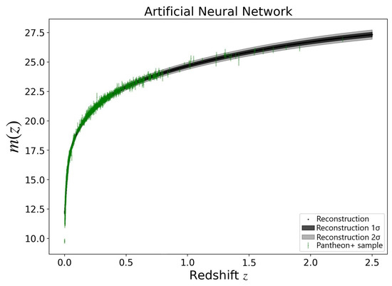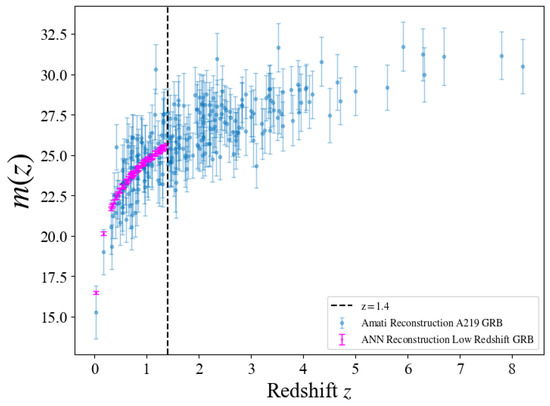 The ANN+BNN reconstruction for fitting Pantheon+ SNe Ia apparent magnitudes are shown in Figure 2. In this work, we utilize the A219 sample [55]3, which is divided into a low−redshift subset (, 79 GRBs) for calibration and a high-redshift subset (, 182 GRBs) for cosmological analysis.