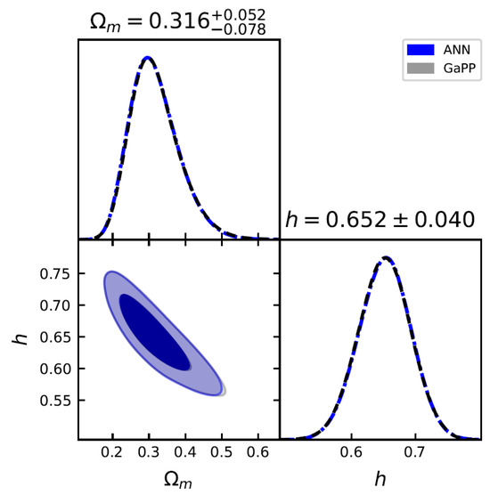 We perform MCMC fitting to constrain the DE models. Constraints using 140 GRBs at are shown in Figure 4 (for the CDM model) and Figure 5 (for the CPL model); and joint constraints using 140 GRBs at and 32 OHD are presented in Figure 6 (for CDM model) and Figure 7 (for CPL model), which are summarized in Table 3. We find that the inclusion of OHD in the joint constraints can tighten the constraints significantly. The results for the CPL model at the 1 confidence level favor a possible DE evolution (). We find that the ANN+BNN results are consistent with those obtained by GaPP, while showing slight differences. Compared to the fitting results from CMB data based on the CDM model at very high redshift ( = 67.36 km s−1, = 0.315) [110] and SNe Ia at very low redshift ( = 74.3 km s−1, = 0.298) [67], we find that the value with GRBs at and OHD at favors the one from the Planck observations and that the value of our results for the flat CDM model is consistent with the CMB observations at the 1 confidence level.