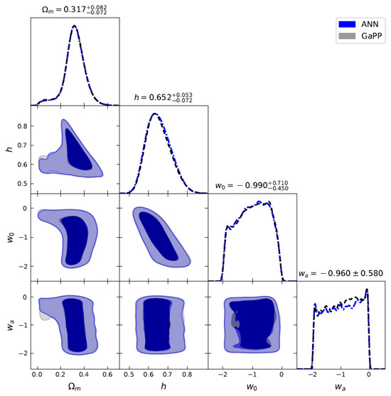 Joint constraints on , h, , and for the flat CPL model using 140 GRBs () + 32 OHD by the ANN and GaPP methods.