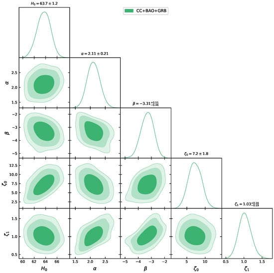 The contour plot for the proposed model, based on the free parameters within the confidence intervals, is constructed using the CC + BAO + GRB dataset.