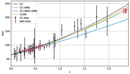 - Moresco, M.; Cimatti, A.; Jimenez, R.; Pozzetti, L.; Zamorani, G.; Bolzonella, M.; Dunlop, J.; Lamareille, F.; Mignoli, M.; Pearce, H. Improved constraints on the expansion rate of the Universe up to z∼1.1 from the spectroscopic evolution of cosmic chronometers. J. Cosmol. Astropart. Phys. 2012, 08, 006. [Google Scholar] [CrossRef]