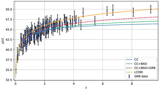 The concordance model, along with the error bars of the datasets, has been considered for comparison purposes with our model. The ability of the concordance model to describe late-time observations is well known. In this context, we consider the Hubble function plot in Figure 4 and the error bar of the datasets that measure . The curves for our model, obtained from the mean values of the MCMC results are in excellent agreement with the standard cosmological model and the error bars. In addition, we follow the methodology for the distance modulus function against the redshift. As shown in Figure 5, all model curves exhibit good agreement with the observational data and the CDM model in the low-redshift regime. At higher redshifts, however, the CC + BAO + GRB combination demonstrates improved consistency with both the standard cosmological model and the GRB data points.