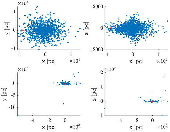 The red stars in the figures denote the location of our solar system in the Milky Way. Effect of distance cut on the shape of reconstructed galaxy. The upper row displays the reconstructed galaxy using reported sources with a proximity threshold of applied, while the lower row displays all the reported sources without the threshold. A frequency derivative threshold of was applied to both reconstructions. Left panels show the face-on view (xy-plane), while right panels show the edge-on view (xz-plane), with the Galactic Center at the origin and the Solar System location marked by the red star.