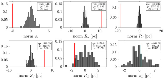 Distribution of estimated galactic structure parameters from 100 independent trials, each using approximately 2100 randomly selected GBs from the true source catalog. The vertical red lines indicate the values from our analysis of GBSIEVER-reported sources. The distributions are normalized to display deviations of reported source results from the ensemble mean in units of the ensemble standard deviation, providing a statistical comparison between reported sources and true source subsets.