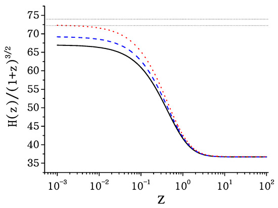 The evolution of the normalized Hubble function in units of km/s/Mpc for CDM cosmology (black solid line) and for Myrzakulov gravity, with and , using , (blue dashed line) and , (red dotted line), where . We impose . The horizontal dotted lines indicate the 1- region estimate km/s/Mpc from SH0ES [49].