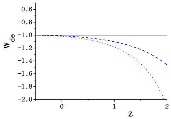 The evolution of the dark energy equation of state in Myrzakulov gravity for and , with , (blue dashed line) and , (red dotted line), where . We impose . For completeness, the black solid line corresponds to the CDM model.