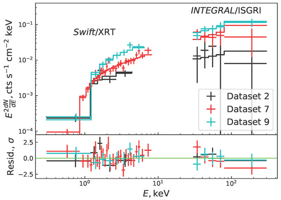 To extend our analysis to softer X-ray energies, we also incorporated Swift/XRT (hereafter XRT, [13]) data in the 0.3–10 keV band, as analyzed in Chernyakova et al. [9]. The excellent time coverage of PSR B1259-63/LS 2883 by XRT allowed us to match each of the nine ISGRI observations with a corresponding XRT observation, separated by no more than 1 day. This resulted in nine joint XRT and ISGRI datasets. The XRT spectra were binned using a minimum of 25 photons with the grppha routine. These spectra were further analyzed using XSPEC v.12.11.0 from HEASOFT v.6.27. Table 1 shows the parameters of the datasets: Science Window ranges (ScW—continuous time intervals during which the satellite maintains a stable pointing), MJD, and time since periastron passage, along with the absorbed PL best fit parameters and fluxes in soft and hard X-ray energy bands. Figure 1 presents examples of such datasets (no. 2, 7, and 9), together with their best fit by the absorbed PL models (Tbabs*powerlaw) and residuals.