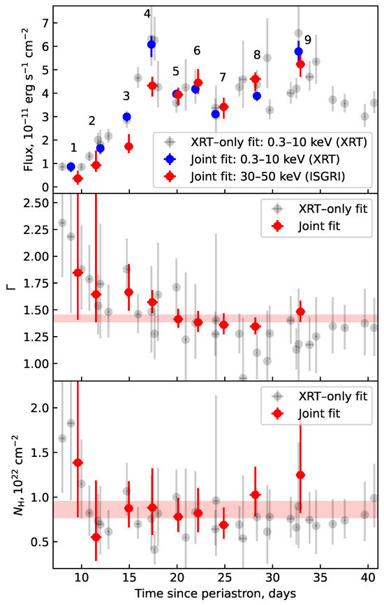 Figure 2 presents the results of the performed analysis. The top panel illustrates the post-periastron PSR B1259-63/LS 2883 light curve obtained from, first, only the XRT data (0.3–10 keV, grey points), and, second, from the joint fit of the XRT and ISGRI data (blue and red points). The blue points indicate the flux derived from the joint fit in the XRT energy range (0.3–10 keV), allowing for a direct comparison with XRT-only data points. The red points correspond to the flux in the 30–50 keV energy range. The Figure shows that the light curve in the hard X-ray band traces the same secondary hump at ∼25–40 days after the periastron, as previously reported in the soft X-ray band, while the nature of this hump remains largely unclear. For example, it could be attributed to a longer electron runaway time caused by the disk’s disruption (see, e.g., [7]).