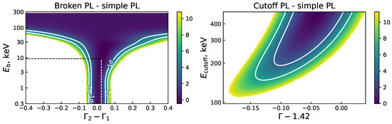 The results are shown in Figure 4 as the change in between the modified and simple PL models. The left panel corresponds to the broken PL model, while the right panel corresponds to the exponential cutoff PL model. The contours denote the and statistical significance contours. For the the broken PL model, we additionally fixed to its best-fit value derived from the joint XRT –ISGRI fit. We explicitly verified that the best improvement of for both and indexes free is , which remains within the statistical fluctuations of the data.