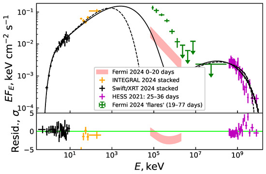 The joint fit of the X-ray and TeV data ranges allowed us to constrain the magnetic field in the emission zone to G. Chernyakova et al. [6] preformed a simultaneous modeling of X-ray, GeV, and TeV spectra, obtaining a magnetic field approximately 5–10 times weaker. However, their analysis was based on 2017 observational data, when the X-ray light curve differed from the 2024 observations.