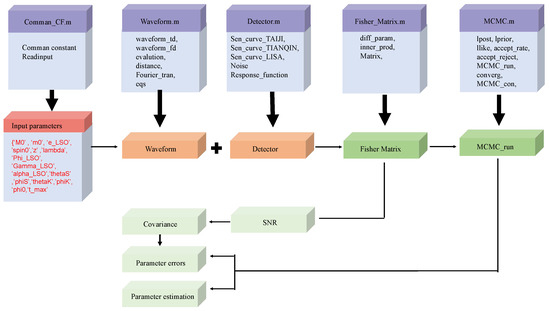As shown in Figure 1, the software is divided into five major modules, namely, the common constants module (Common_CF.m), the waveform generation module (Waveform.m), the detector module (Detector.m), the FIM module (Fisher_Matrix.m) and the MCMC module (MCMC.m). The common constants module (Common_CF.m) primarily encompasses common constants (Common_constants.m) and the input parameter function (Readinput( )). The waveform generation module (Waveform.m) provides GW waveform templates, and the detector module offers functions related to the detectors, such as the detector response functions, noise function, and sensitivity curves. Using the FIM module, we can initially calculate the SNR of GW and the covariance of parameters, ultimately yielding parameter errors. Furthermore, the posterior distribution of the parameters can be obtained through the MCMC_run( ) function within the MCMC module (MCMC.m),