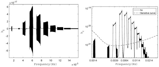 in which is an azimuthal angle used to measure the direction of the pericenter relative to the x axis [23], and is defined as . D is the luminosity distance, and , , and are the superpositions of Bessel functions related to the eccentricity [23]. As for the circular orbital case, is zero. Therefore, we have obtained the GW source signal by the superposition of harmonic waves.