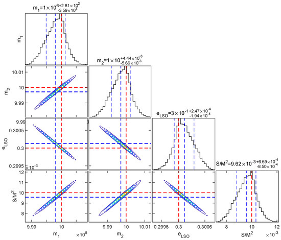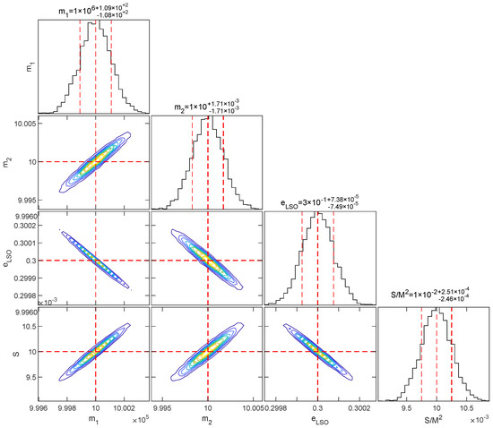After verifying the correctness of MatBYIB’s PE using the FIM (in Appendix A), we can derive the posterior distributions of the parameters by FIM. In Figure 5, we plot the results of the posterior distributions for the central BH , the small mass , the eccentricity corresponding to the last stable orbit , and the spin of BH . The one-dimensional marginal posterior distributions demonstrate that the FIM yields Gaussian profiles centered on the true parameters with standard deviations, as theoretically expected; the red dashed line represents the true value, while the thin blue dashed lines indicate the confidence interval. The two-dimensional joint distributions reveal parameter correlations through confidence regions represented by color-coded contours. Quantitative analysis of these bivariate distributions indicates strong correlations among all four parameters (, , , and .