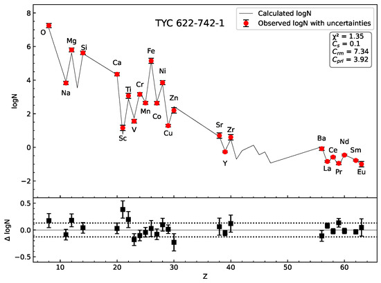 Top panel: Best fit of the calculated abundances of 25 elements in TYC 622-742-1 (solid line) compared to the observed abundances (filled circles with error bars). Bottom panel: Relative offsets (), along with observed uncertainties and standard calculated errors in (dotted lines).