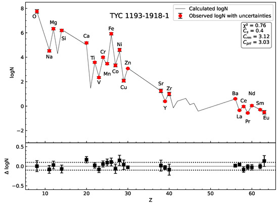 where and denote the observed abundance and its associated error for the ith element, which are obtained from [24]. represents the corresponding calculated abundance of the ith element, derived using Equation (1). For TYC 622-742-1 and TYC 1193-1918-1, the total number of elements (K) analyzed in this framework is 25 and 24, respectively, while the number of free parameters () is fixed at 3 in both cases. In our calculations, we obtained minimum values of 1.35 for TYC 622-742-1 and 0.76 for TYC 1193-1918-1. We obtained three component coefficients for both sample stars, which are listed in Table 1.