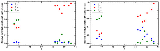where the meanings of , , , , , and are the same as in Equation (1). The values of , , and are 7.34, 3.92, and 0.1 for TYC 622-742-1 and 3.12, 3.03, and 0.4 for TYC 1193-1918-1, respectively. We also calculated the relative contribution ratios of the primary process and the main s-process to the n-capture elements using Equation (3). The calculated results are shown in Figure 5. The y-axis represents the relative contribution ratios of each astrophysical process. The blue-, red-, and green-filled circles represent the contribution ratios of the main s-process (), main r-process (), and primary process () to the n-capture elements, respectively.