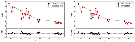 Comparison of the observed abundance pattern of TYC 622-742-1 with that of HD 222925. In the left panel, the abundances of HD 222925 are normalized to the Fe abundance of TYC 622-742-1, while in the right panel, they are normalized to the Eu abundance of TYC 622-742-1. The observed abundances of TYC 622-742-1 are black squares, and those of HD 222925 are red circles. The relative abundance offsets () are displayed in the bottom panels.