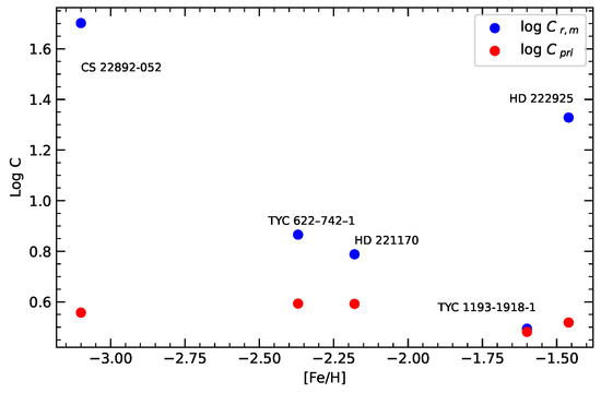 We present the component coefficients of our sample stars on a logarithmic scale along with those of HD 222925, HD 221170, and CS 22892-052 as a function of metallicity (see Figure 8). The component coefficients of CS 22892-052 and HD 221170 were calculated by Li et al. [27] using the formula . Here, represents the prompt component abundances and is the component coefficient of the prompt component. The theoretical abundances of the P component were extracted by Li et al. [27] from an EMP star BD-185550. Since the [Sr/Fe] ratio of BD-185550 is very low, its abundances have contributions from early massive stars. They calculated the P component coefficients for MP stars using the abundance decomposition method. Wen et al. [38] studied HD 222925 using a similar method and derived the coefficient. This analysis provides valuable insights. It is observed that the stars at intermediate metallicities, such as TYC 622-742-1 and HD 221170, exhibit moderate values of . This suggests that these stars formed in an environment where the interstellar medium (ISM) had already undergone substantial nucleosynthetic enrichment beyond the earliest r-process events, such as neutron star mergers or rare supernovae. In contrast, TYC 1193-1918-1 with [Fe/H] = −1.6 shows lower values compared to other stars, suggesting that the interstellar medium (ISM) from which this star formed was more diluted. This dilution occurs as a result of mixing with less enriched material, which could reflect a longer period of star formation. Moreover, the slightly lower log C values of TYC 1193-1918-1 suggest that the star has been influenced by multiple astrophysical processes, potentially from processes associated with core-collapse supernovae.