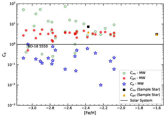 - Matas Pinto, A.D.M.; Caffau, E.; François, P.; Spite, M.; Bonifacio, P.; Wanajo, S.; Aoki, W.; Monaco, L.; Suda, T.; Spite, F.; et al. Detailed investigation of two high-speed evolved Galactic stars. Astron. Nachrichten 2022, 343, e210032. [Google Scholar] [CrossRef]