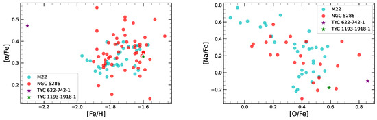 Based on the above discussion, we compare the ratios of our sample stars with those of two GCs, namely M22 and NGC 5286 [48,49] (see left panel of Figure 10). M22 lies nearly in the plane of the Milky Way, towards the bulge, while NGC 5286 is located at a distance of 8.9 kpc from the Galactic Centre and 11.7 kpc from the Sun, placing it likely in the halo of the MW. In both clusters, the metallicities of stars span from [Fe/H] to , i.e, MP to mildly metal-rich, similar to our sample stars. Furthermore, both clusters consist of stars in the red giant branch (RGB) phase, consistent with the evolutionary stage of our sample stars. The elemental abundance patterns observed in TYC 622-742-1 and TYC 1193-1918-1, particularly their positions in the versus [Fe/H] diagram, suggest an origin in environments where star formation occurred rapidly during the early stages of Galactic evolution, such as GCs or proto-Galactic building blocks. The enhanced ratios of our stars reflect enrichment dominated by core-collapse supernovae and are comparable to those observed in M22 and NGC 5286. Moreover, the elevated [O/Fe] and suppressed [Na/Fe] ratios in our sample stars are consistent with the chemical signatures of first-generation GC stars. These stars likely formed before the onset of internal cluster enrichment processes that generate the well-known Na–O anticorrelation (see right panel of Figure 10). These features collectively support the conclusion that our sample stars were dynamically expelled from their birth clusters via dynamical interactions or tidal stripping. While they do not appear to be directly associated with M22 or NGC 5286, their position in the Na–O plane aligns with the first-generation stars likely ejected from GCs. It is plausible that their parent systems are no longer gravitationally bound or may have been entirely disrupted.