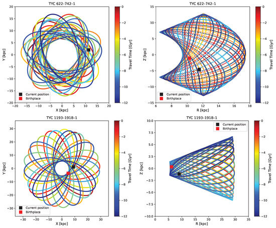 The kinematic and chemical characteristics of the high-velocity stars TYC 622-742-1 and TYC 1193-1918-1 provide valuable insights into their origins and dynamical histories. Using the Galpy package [50], we modeled the orbital backtracking of these stars within a Galactic potential over a timescale of approximately 12 Gyr, as suggested by Matas Pinto et al. [24]. The results are presented in Figure 11, where the upper row illustrates the orbital evolution of TYC 622-742-1 and the lower row corresponds to TYC 1193-1918-1. In each row, the left panel shows the orbit projected in the Galactic plane, while the right panel depicts motion in cylindrical R–Z coordinates. The color gradient traces the temporal progression of each orbit in Gyr. Red squares mark the inferred birth locations of the stars, and black squares indicate their present positions.