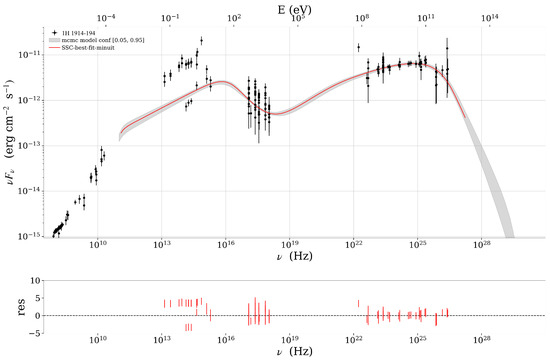 Broadband SED of 1H 1914–194 fitted with a one-zone SSC model. The solid red curve indicates the best-fit spectrum, while the shaded gray band denotes the 1 confidence interval. Low-frequency radio measurements (< eV) are plotted for reference but were excluded from the fit, since synchrotron self-absorption in the compact emission zone prevents these data from constraining the model parameters. The large spread of points in the optical and X-ray bands is primarily due to intrinsic variability, with data collected at different epochs and likely representing both high- and low-flux states.