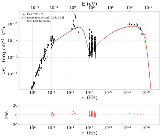 Broadband SED of PKS 0735+178 fitted with a one-zone SSC model. The solid red curve indicates the best-fit spectrum, while the shaded gray band denotes the 1 confidence interval. Low-frequency radio measurements (< eV) are plotted for reference but were excluded from the fit, since synchrotron self-absorption in the compact emission zone prevents these data from constraining the model parameters. The large spread of points in the optical and X-ray bands is primarily due to intrinsic variability, with data collected at different epochs and likely representing both high- and low-flux states.