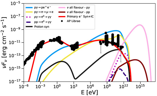 Lepto-hadronic SED model for AP Librae, overlaid with archival multiwavelength data. The solid red curve shows primary electron synchrotron emission (∼– eV) and primary inverse-Compton scattering (∼– eV). Hadronic contributions include Bethe–Heitler pair production (, light blue; ∼– eV), photopion cascades from charged pions (, yellow; ∼– eV), and gamma rays from neutral-pion decay (, pink dotted; ∼– eV). Proton–proton interactions are shown by the purple dashed curve (∼– eV), and proton synchrotron and inverse-Compton emissions are shown by the solid black curve (∼– eV). The all-flavor neutrino fluxes from photohadronic (, pink) and proton–proton (, brown) channels dominate above – eV and – eV, respectively.