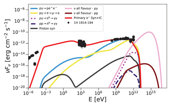 Lepto-hadronic SED model for 1H 1914–194, overlaid with archival multiwavelength data. The solid blue curve shows primary electron synchrotron emission (∼– eV), and the solid red curve shows primary inverse-Compton scattering (∼– eV). Hadronic contributions include Bethe–Heitler pair production (, light blue; ∼– eV), photopion cascades from charged pions (, yellow; ∼– eV), and gamma rays from neutral-pion decay (, pink dotted; ∼– eV). Proton–proton interactions are shown by the purple dashed curve (∼– eV), and proton synchrotron and inverse-Compton emissions are shown by the solid black curve (∼– eV). The all-flavor neutrino fluxes from photohadronic (, pink) and proton–proton (, brown) channels dominate above – eV and – eV, respectively.