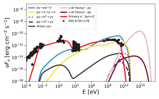 Figure 4, Figure 5 and Figure 6 display the multiwavelength SEDs of AP Librae, 1H 1914–194, and PKS 0735+17, respectively, together with archival data from radio through gamma rays. The red curve corresponds to the synchrotron and inverse-Compton emission of primary electrons (JetSeT best-fit); the black curve shows proton synchrotron and proton-induced inverse-Compton emission. The light blue curve denotes Bethe–Heitler pair production (), while the green curve marks the emission from secondary pairs produced via photon–photon interactions (). The yellow curve represents the cascade from charged-pion decay (), and the purple dotted line illustrates gamma rays from neutral-pion decay in photopion processes (). The dark blue dashed curve shows the gamma-ray output from neutral-pion decay in proton–proton collisions (). Finally, the pink curve represents the all-flavor neutrino fluxes from interactions, while the brown curve represents those from interactions.