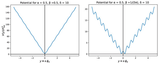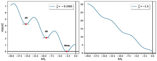 A possible physical interpretation of the series of de Sitter vacua depicted in Figure 1 (left panel) is given at the end of Section 4. Also in Figure 1 (right panel), we depict the potential in the case when . This case is to be understood as the case in which the potential becomes approximately linear with minor modulations.
