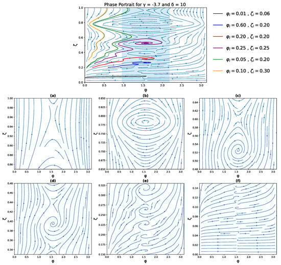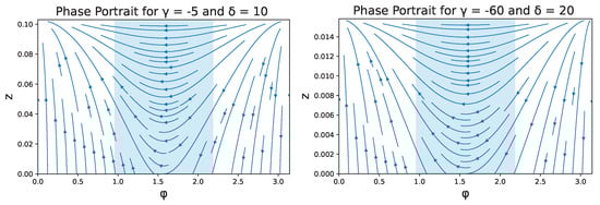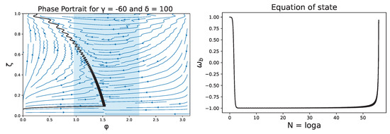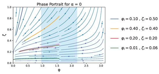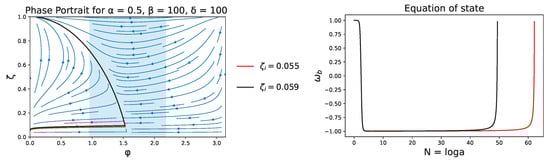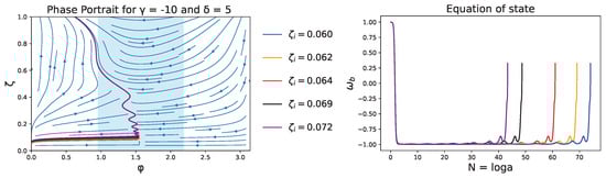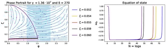 which guarantees the dominance of the linear term in the axion potential. The results are depicted in Figure 2, for different initial conditions. The shaded rectangular region in the phase space (for this and all subsequent phase portraits in this article) corresponds to an accelerated expansion, with EoS . To plot the EoS we used (39).