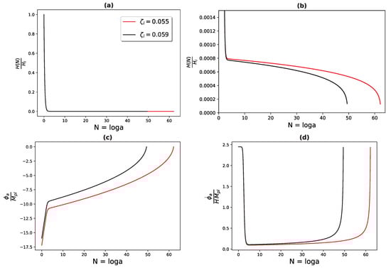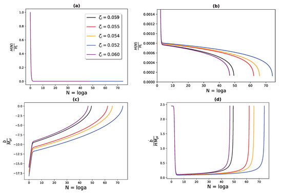 From the above critical-point analysis, it follows that our dynamical system (43) is characterized by qualitatively different phase spaces, and consequently stability behavior, depending on whether or . The former case contains the two families of critical points , , while the latter, in which such families are absent, is qualitatively similar to the case studied in []. In other words, at , bifurcation of the critical points occurs [] (see also note Section Stability Analysis, as well as the detailed discussion on the nature of the stability of this case in Appendix C.1 of Appendix C, where it is also shown that the fixed points correspond to a family of saddle points). With these remarks in mind, we now proceed to study inflation in these regimes for the potential (24), giving emphasis on determining phenomenologically interesting (metastable) inflationary scenarios.